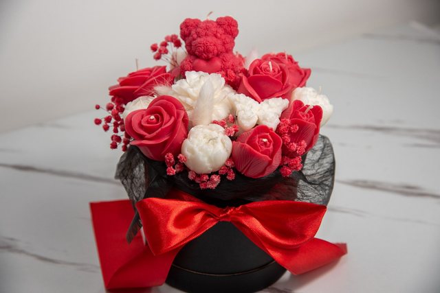 Handcrafted with care, this luxury candle bouquet is made from soy wax and designed to resemble a stunning arrangement of red roses and white