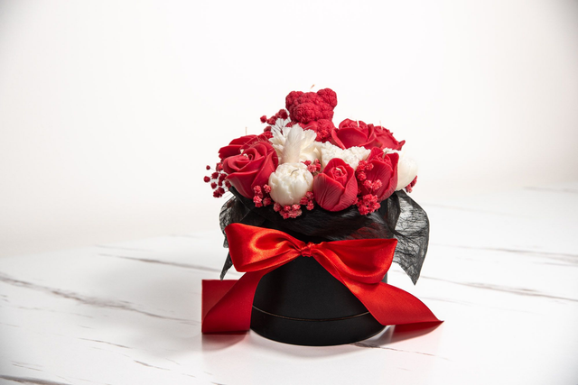 Wrapped in a sleek black hatbox and finished with a bold satin ribbon, this candle bouquet makes a truly extraordinary gift or centrepiece for weddings, anniversaries, and luxury home décor or just treat yourselves.