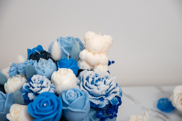 Forever Yours is more than a candle—it's a handcrafted floral bouquet in wax, made to express romance, elegance, and timeless devotion. Featuring a breathtaking arrangement of flower designs in soft blue, baby blue, and white, this large statement candle is perfect for weddings, romantic gifts, or elegant home décor.